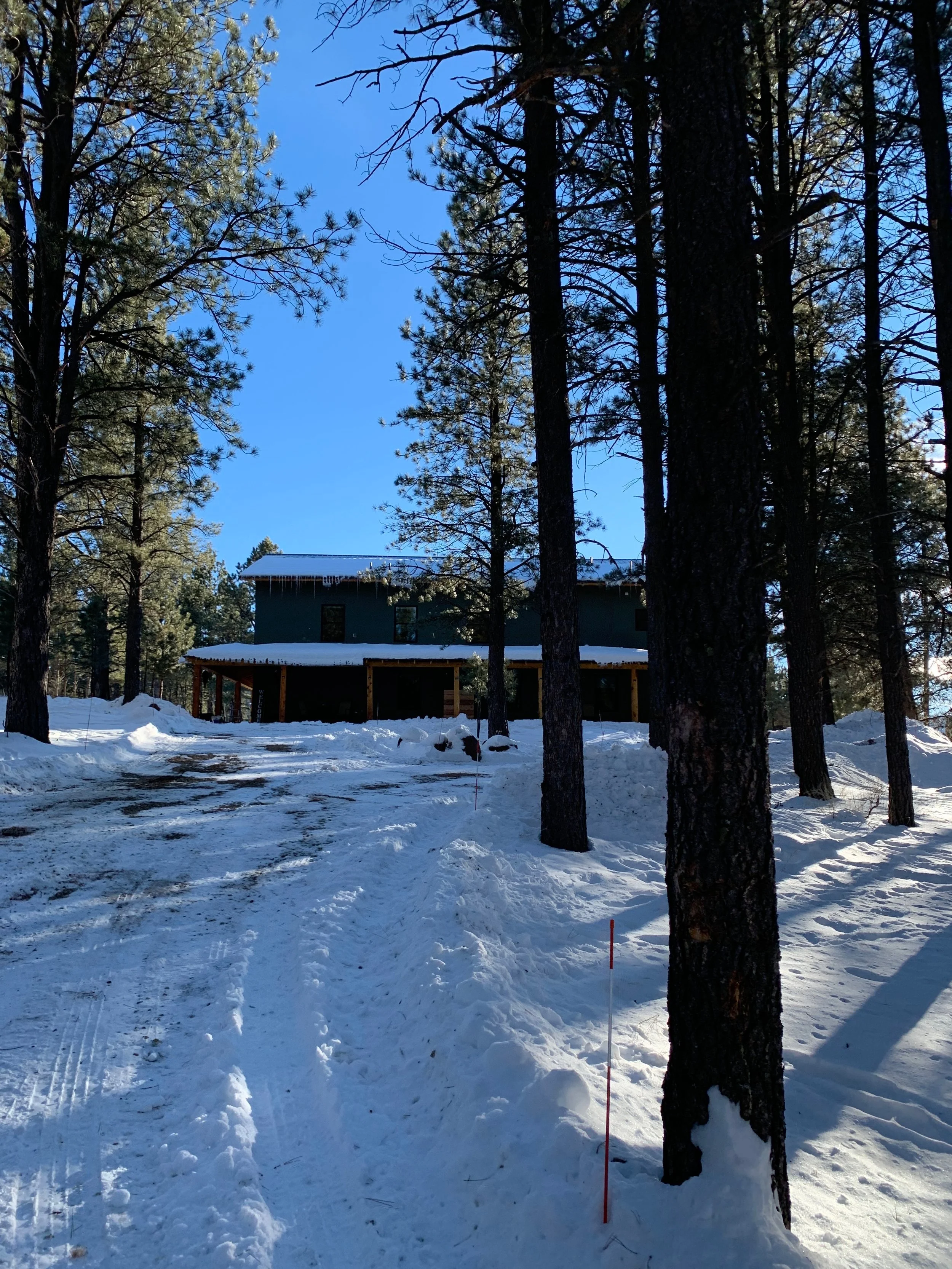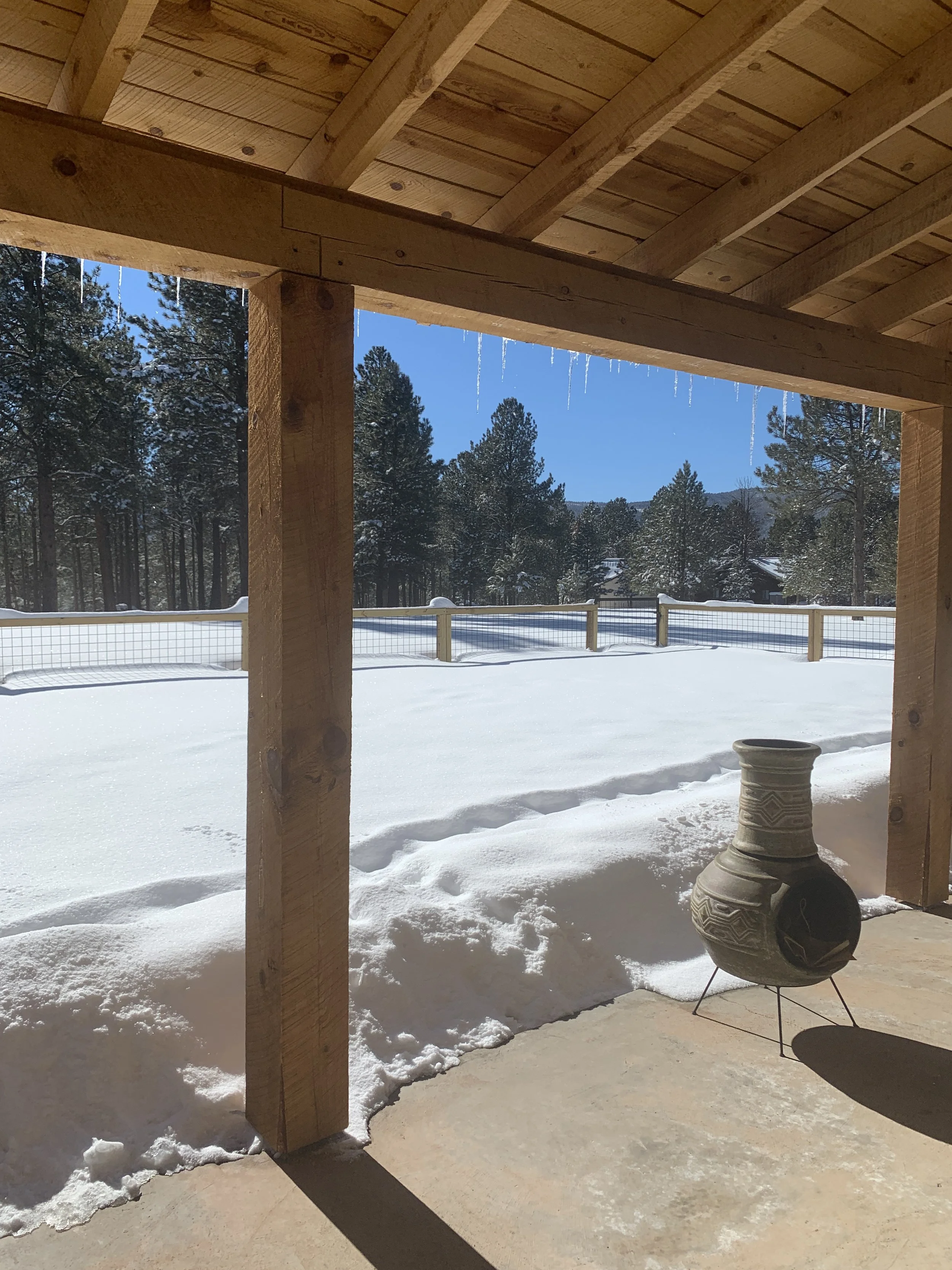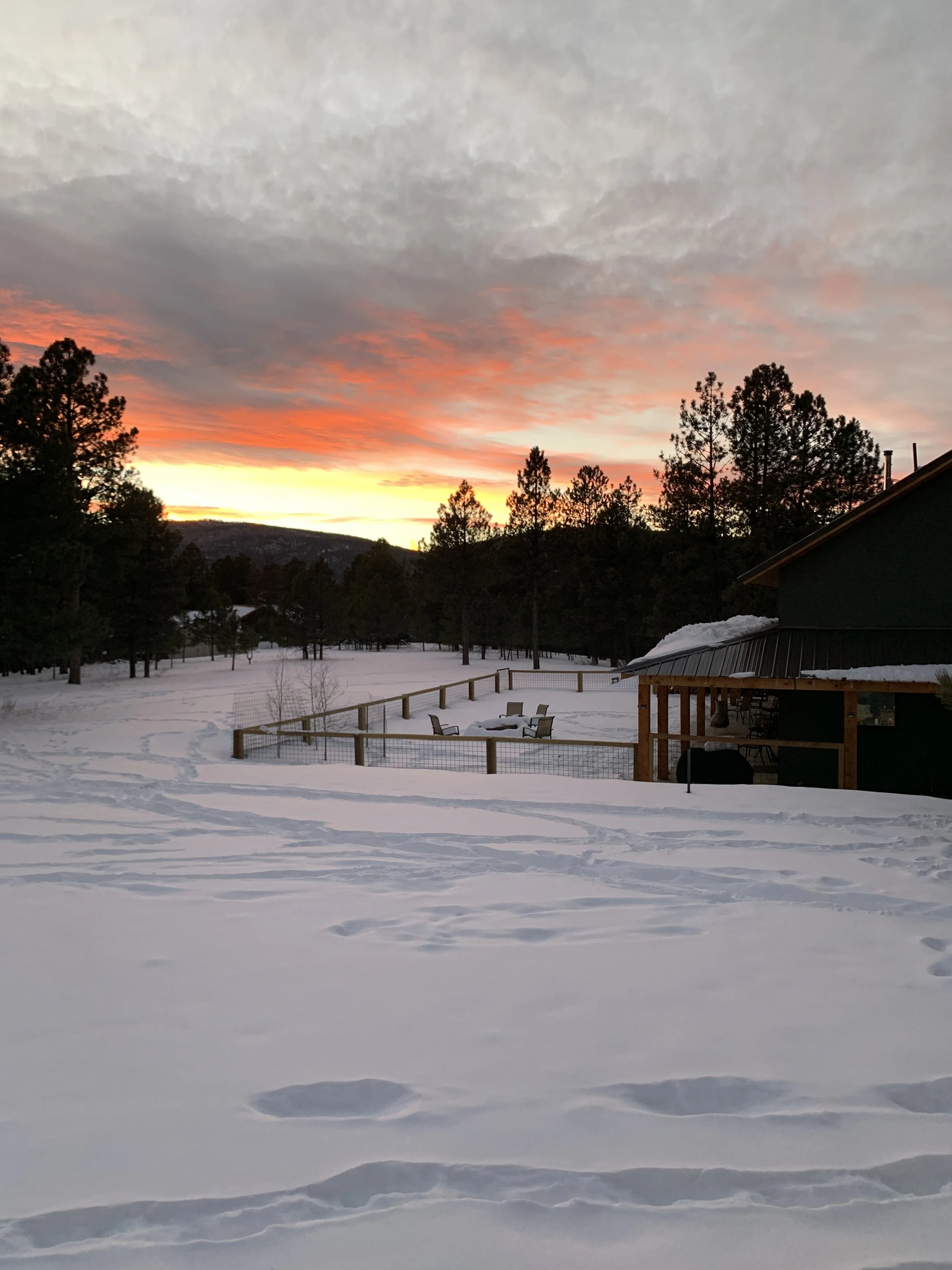 Scissor Tailed Lodge's snowy backyard at sunset.
